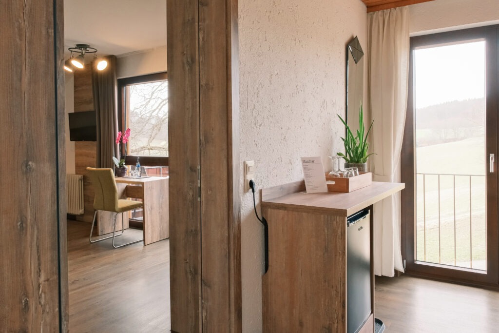 Mach es dir in unserer neuen Suite richtig gemütlich. Dich erwartet ein stilvoll eingerichteter Raum mit hochwertigem Vinylboden, einem großzügigen Sofa zum Verweilen und einem wendbaren Flatscreen-TV, den du perfekt auf die Couch oder dein komfortables Boxspring-Doppelbett ausrichten kannst. Wenn du in Ruhe etwas erledigen möchtest, bietet dir der Schreibtisch als heller Arbeitsplatz einen direkten Blick ins Grüne – kostenloses WLAN und ein Telefon sind selbstverständlich vorhanden. Für den kleinen Genuss zwischendurch steht ein separater Bereich mit Minibar sowie einer Kaffee- und Teestation bereit. Für zusätzlichen Komfort sorgt ein separates WC. In der Suite befindet sich ein Ganzkörperspiegel Der Balkon: Tritt hinaus und lass den ungestörten Blick tief in die Natur auf dich wirken.